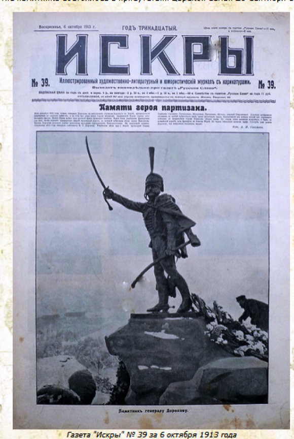 А через 100 лет 29 сентября 1913 года в присутствии царской семьи состоялось торжественное открытие памятника Герою Войны 1812 года. Авторами первого памятника Дорохову были скульптор Б.В. Пациорковский и командир Сумского гусарского полка А.О. Рахманинов.