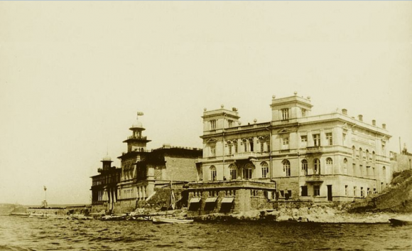 Здание первой лаборатории биостанции постройки 1893-94 гг., за ним жилой барак (не сохранились).