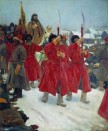 На пустой серой площади остался лежать лицом в землю расстрелянный; вдали высятся мрачные силуэты домов и чуть намечены фигуры уходящих жандармов. Никто из предшественников живописца не достигал такой силы и выразительности в передаче мотива из современной истории. Однозначно художник стремился к искусству остродраматическому, чутко передающему «биение человеческой души», оставаясь художником-реалистом.