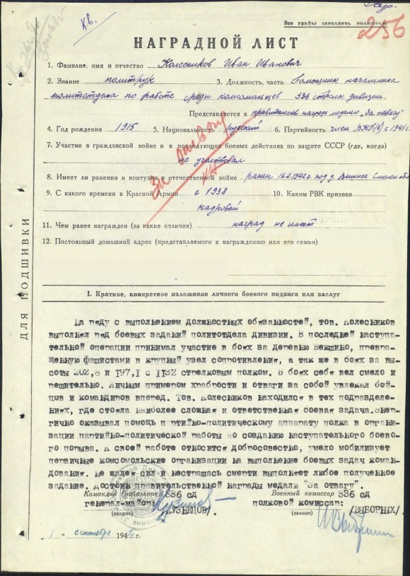 Наградной лист (ЦАМО ф. 33 оп. 682524 д. 359 л. 256 с об.)