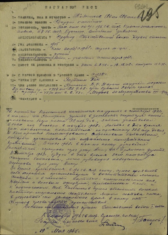 наградной лист (ЦАМО ф. 33 оп. 687572 д. 675 л. 195 с об.)