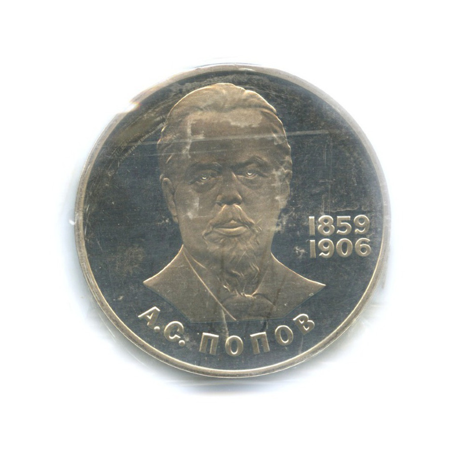 На реверсе в центре – рельефное изображение Александра Степановича Попова. Справа в две строки указаны годы его жизни – «1859-1906», а внизу полукругом надпись «А.С. Попов».