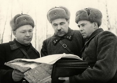 На фото: Командующий 5-й армией генерал-лейтенант артиллерии Л.А.Говоров (в центре) с подчиненными командирами. Декабрь 1941 г.