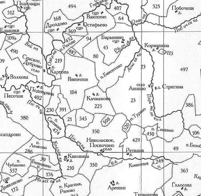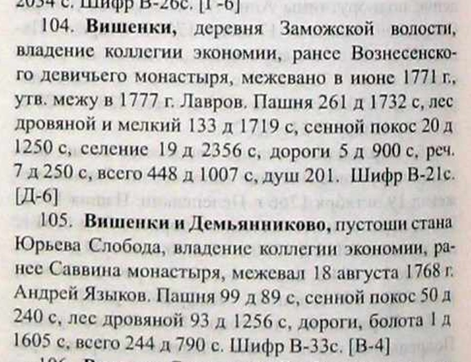 Есть и более поздние упоминания об деревне Вишенки - в книге Кусова В.С. «Земли Московской губернии в XVIII веке». Более того, называется еще и пустошь ВИШЕНКИ, расположенная недалеко от одноименной деревни.