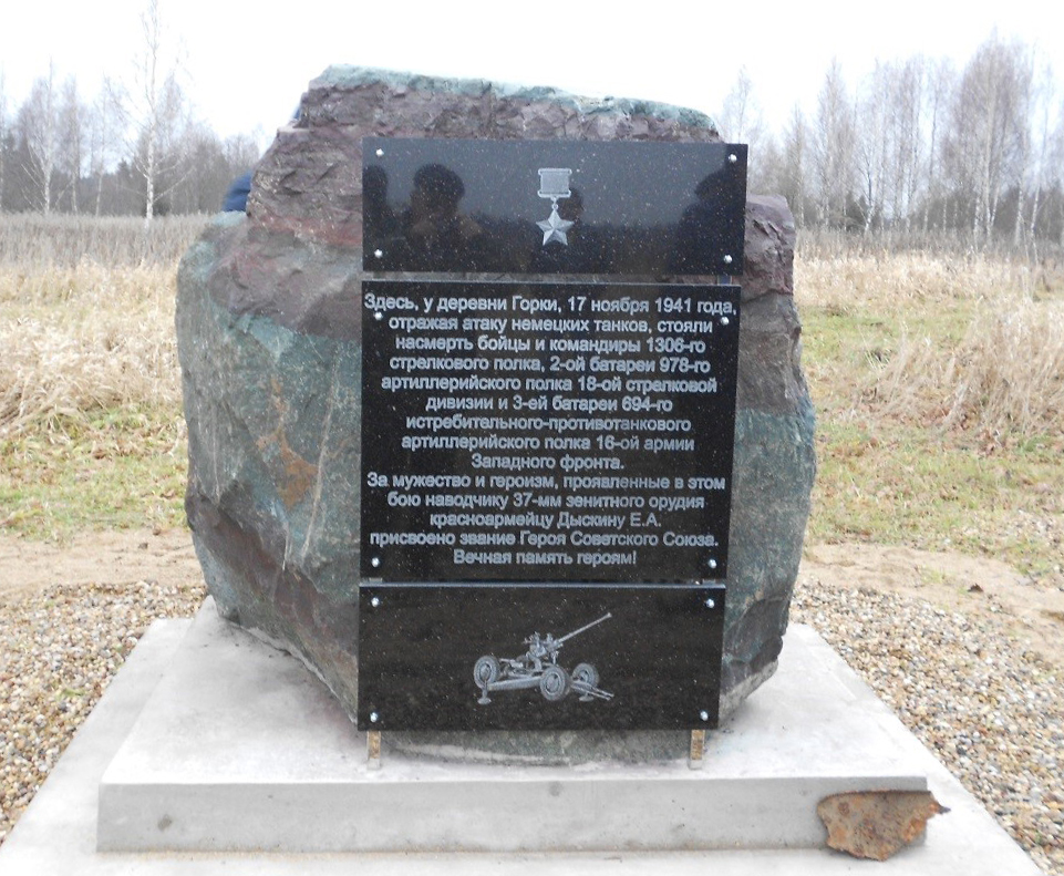 16 ноября 2019 года на высотке вблизи бывшей деревни Горки благодарными потомками и наследниками Победы, представляющими поисковые отряды «Надежда» (Руза), «Луч» (Можайск), «Память» (Тверская обл.), Книгу памяти Московской области, главную редакцию журнала «Военная археология», музей Сергея Докучаева, Рузским казачеством и другими неравнодушными гражданами в день 78-летия совершения подвига по защите нашего округа в годы Великой Отечественной войны был открыт памятный знак Ефиму Дыськину. В мероприятии участвовало более 50 человек.