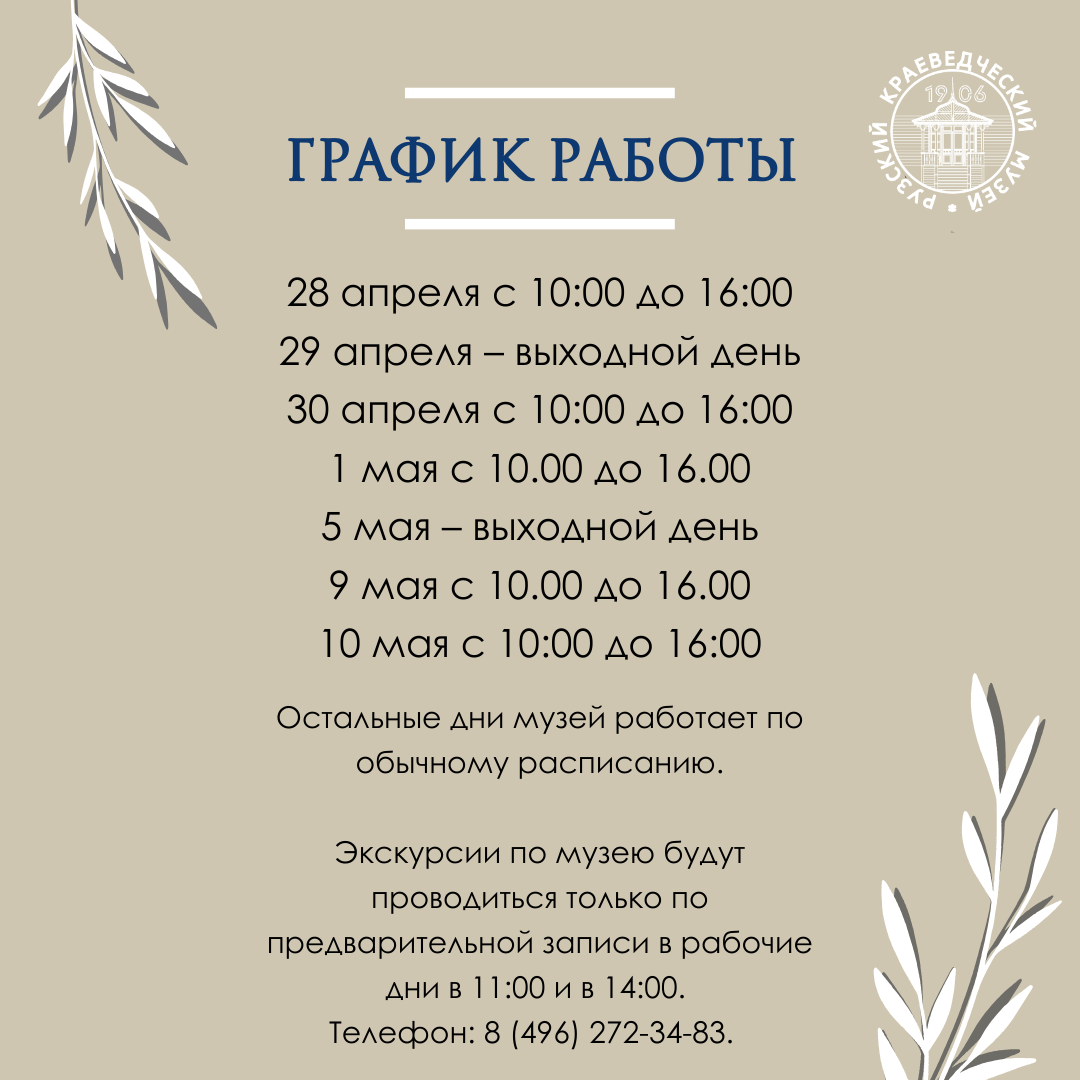 В майские праздники Рузский краеведческий музей будет работать по следующему графику: