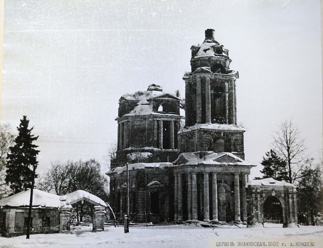 Во время Великой Отечественной войны на колокольне Знаменского храма располагался наблюдательный пункт Красной Армии. Колокольня и здание церкви активно обстреливались немцами и были почти полностью разрушены. Сильно пострадали и деревья усадебного парка, особенно досталось старой сосне – снаряд срезал ее верхушку. Время завершило разорение храма.