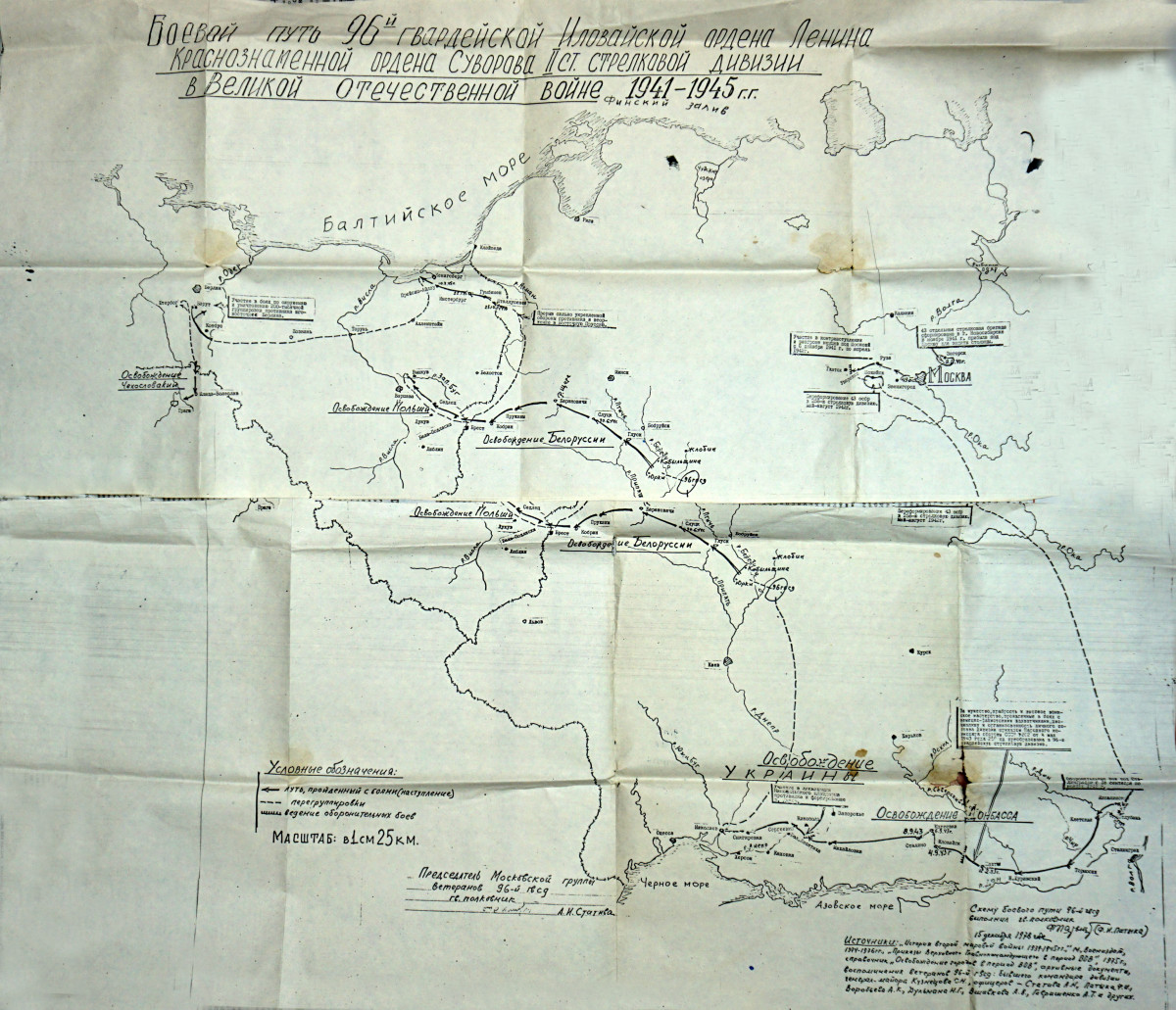 Схему боевого пути 96-й гв.с.д. выполнил гвардии полковник Ф. И. Патыка 15 декабря 1976 года. По всей карте имеются пояснительные надписи.