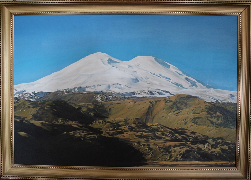 Пейзаж выполнен маслом на холсте. На переднем и заднем планах виднеются горы, покрытые снегом, на фоне голубого неба. На обороте надпись: «Жителям Рузского в честь 680- летия ознаменования города Рузы от руководства Эльбрусского района Кабардино-Балкарской Республики. 30. 08. 2006 г.».