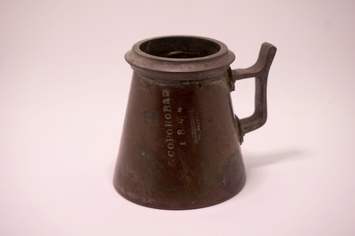 В нашем музее хранится мерная кружка. Она представляет собой сосуд высотой 9 см конусообразной формы с ручкой. К верхней кромке приклепано массивное кольцо фигурного профиля. Дно емкости утоплено. На конической поверхности имеется клеймо: «Сороковая» ШАПОШНИКОВ г.МОСКВА.