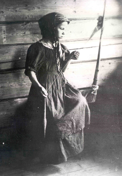 Кудель – это вычесанные волокна шерсти или льна, прикрепленные к лопасти или гребню прялки. Постепенно вытягивая волокна, пряха накручивала их на вращающееся веретено и получала нить. На верхнем конце веретена иногда устраивалась «бородка» для завязывания петли. Скрученная нить затем подматывалась на веретено и захлестывалась петелькой на его верхнем конце, чтобы не разматывалась и не соскакивала.