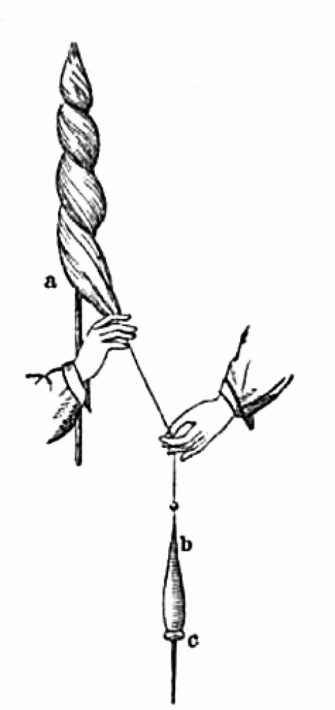 Веретено служит основой для наматывания будущей нити. Его форма и размеры выверены столетним опытом существования прядения. На рисунке показано прядение с помощью веретена, где a — кудель, b — веретено с намотанной на него пряжей, c — пряслице.