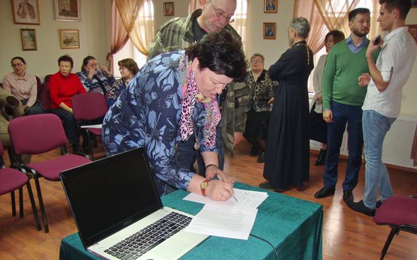 Учитель истории Гимназии №1, краевед А.Б.Сапегина подписывает Обращение в Совет депутатов РГО