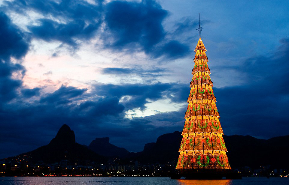 Ёлка в Рио-де-Жанейро весьма оригинальна. Её устанавливают на фоне скульптуры Христа-Спасителя. Это огромная металлическая конструкция весом 500 тонн, которая располагается на плавучих блоках на водной поверхности лагуны Родриго-де-Фрейтас.