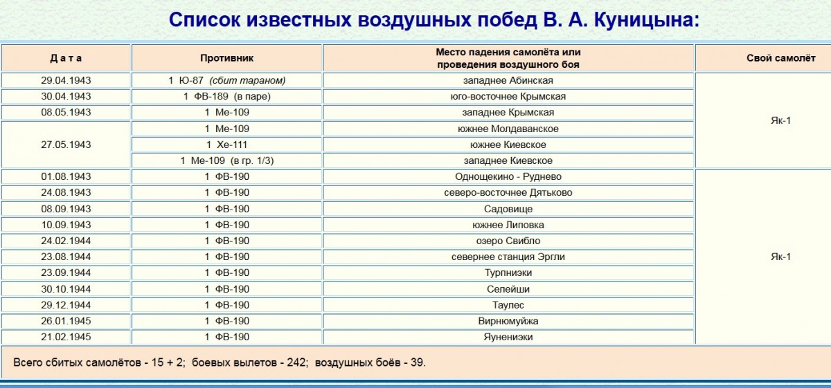 О В.А. Куницыне товарищи и командиры отзывались: «дерзок, смел и расчетлив». В.А.Куницын произвел 237 боевых вылетов, в том числе на сопровождение штурмовиков — 1 130 вылетов, на прикрытие своих войск — 59 вылетов, на штурмовку войск противника — 13 вылетов, на перехват, свободную охоту и разведку — 35 вылетов.