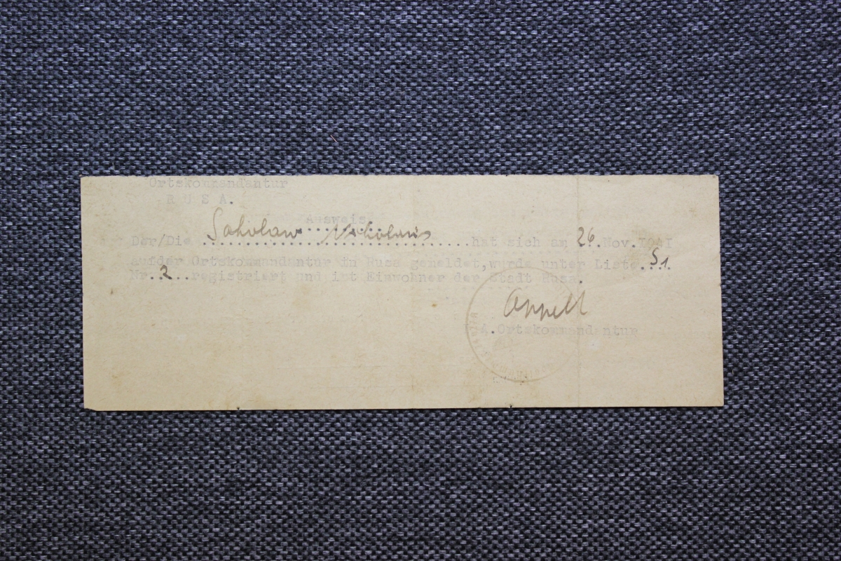 В музейной коллекции нашего музея хранится «Аусвайс». Напечатан на обрезке бланка на вывоз леса. Выдан оккупационной комендатурой г. Рузы. Данные о жителе и его регистрации вписаны от руки чернилами. Текст на немецком языке: «Ortskommandantur/ RUSA./ Ausweis//Der/Die Sokolow Nikolaei hat sich am 26. Nov. I94I/ auf der Ortskommandantur in Rusa gemeldet, wurde unter Liste S1/ Nr 2 registriert und it Einwohner der Stadt Rusa./ A. Ortskommandantur».