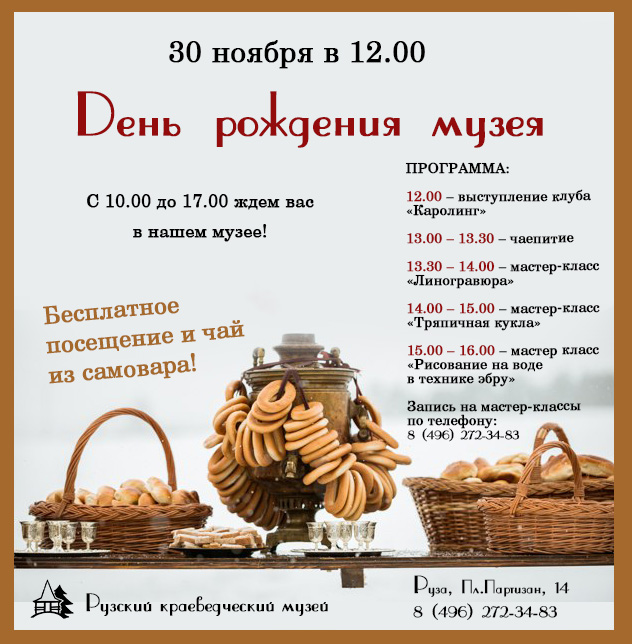30 ноября Рузский краеведческий музей отметит день рождения и проведет день открытых дверей. Для гостей пройдут мастер-классы и лекция по истории средневекового оружия. Музей будет открыт с 10.00 до 17.00, а праздничная программа начнется с 12.00.