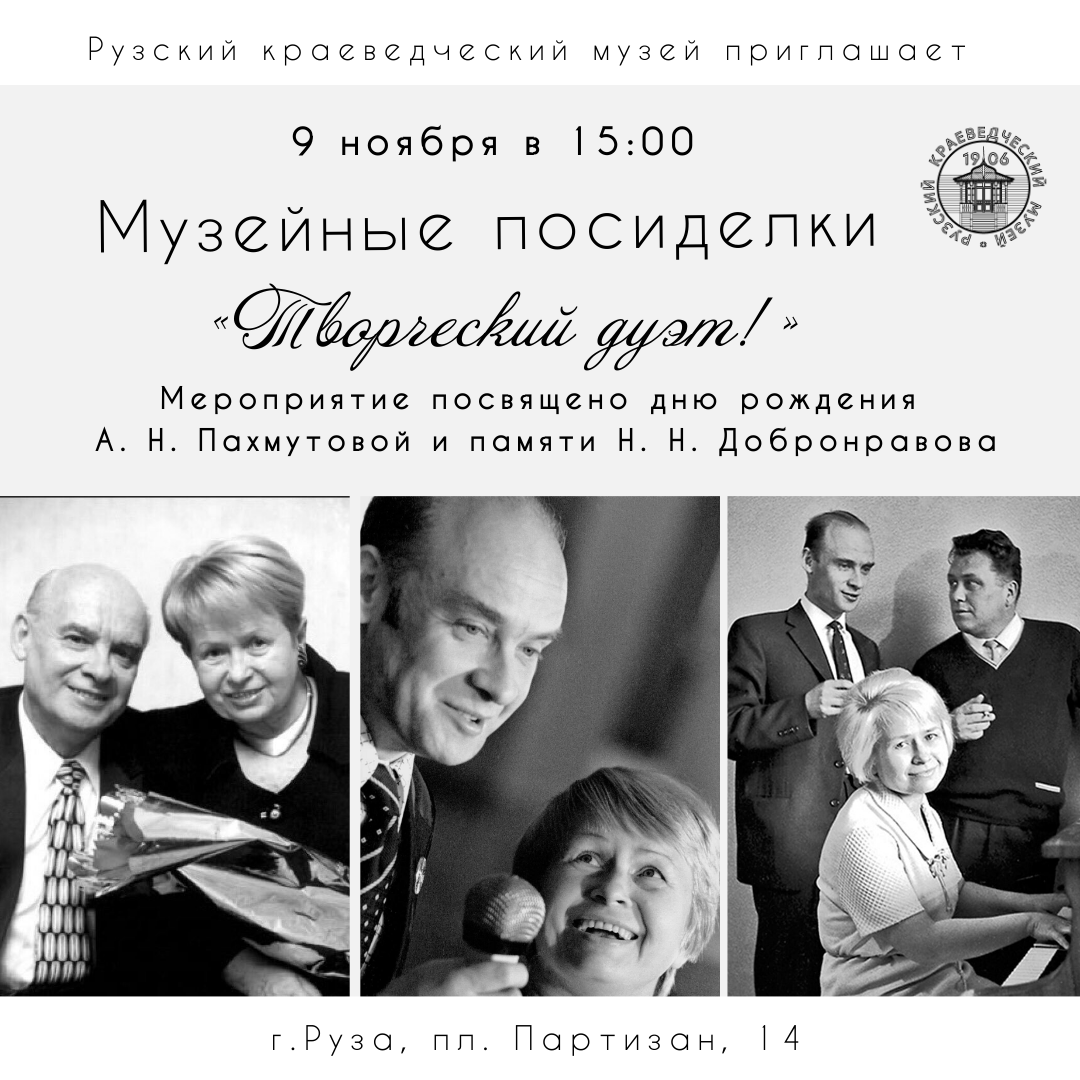 9 ноября в 15:00 Рузский краеведческий музей приглашает вас на Музейные посиделки «Творческий дуэт!». Мероприятие будет посвящено дню рождения А. Н. Пахмутовой и памяти Н. Н. Добронравова.