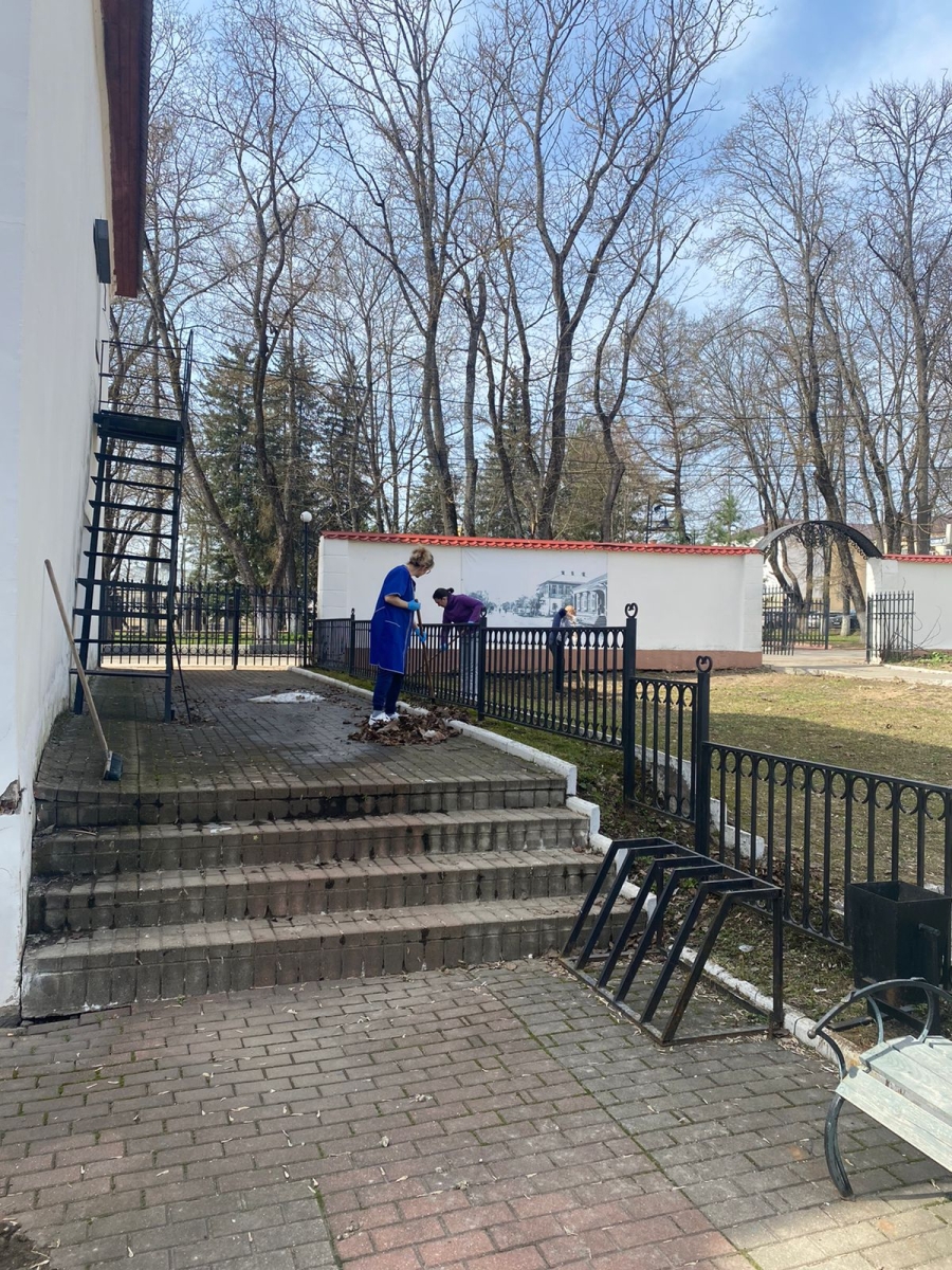 Сотрудники учреждения убрали территорию у здания музея, привели в порядок клумбы и газоны, покрасили лавочки, фонарные столбы и входную группу.