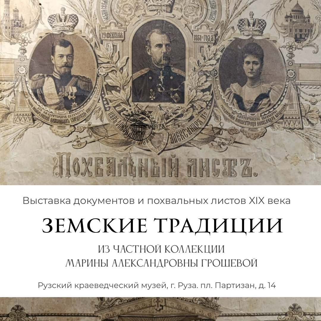 В Рузском краеведческом музее открыта выставка документов и похвальных листов XIX века «Земские традиции» из частной коллекции Марины Александровны Грошевой – руководителя Межрегиональной общественной организации возрождения земских традиций «Народный Земский Собор».
