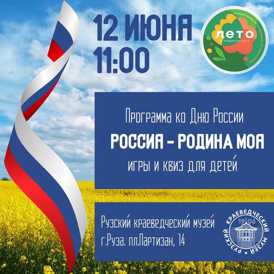11 июня в 11:00 в Рузском краеведческом музее пройдёт программа "Россия - Родина моя", приуроченная ко Дню России.