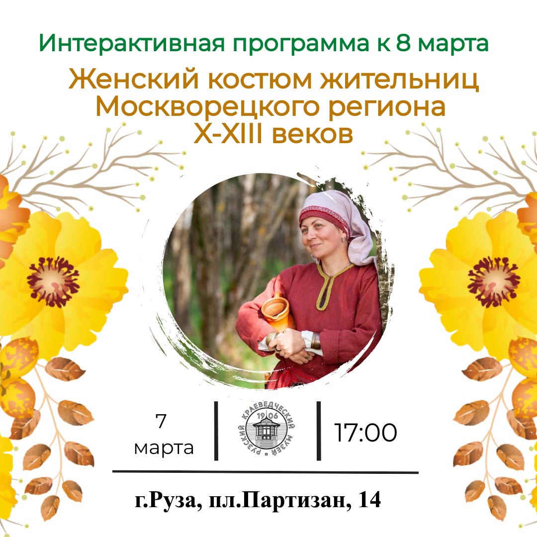 7 марта, в преддверии Международного женского дня, Рузский краеведческий музей приглашает вас на интерактивную программу «Женский костюм жительниц Москворецкого региона X-XIII веков».