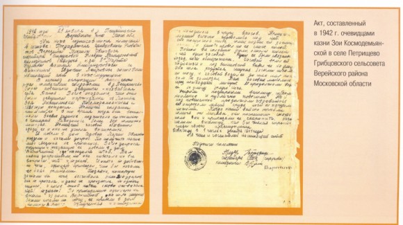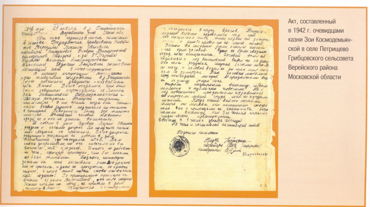 Скупые строки подлинных документов, хранящихся в Центральном государственном архиве Московской области, рассказывают о зверской расправе над Зоей Космодемьянской в деревне Петрищево Верейского района. В доме М.И. Седовой Зою раздели и начали допрос. Не добившись никаких сведений, ее, босую и раздетую, повели в дом Ворониной, где снова допрашивали и, не получив других ответов, кроме «нет» и «не знаю», начали бить ремнями. Хозяйка, которую немцы загнали на печь, насчитала до 200 ударов. По приказанию немецкого офицера Зою повели в дом В.А. Кулик, возле которого менявшиеся каждые 15 минут часовые водили ее по снегу всю ночь. Утром собрали все население деревни, и на его глазах Зою Космодемьянскую повесили .