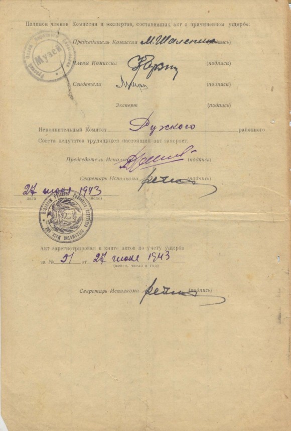 Чрезвычайная Государственная Комиссия, рассмотрев представленные Московской областной чрезвычайной комиссией по установлению и расследованию злодеяний немецко-фашистских захватчиков 9578 актов и обобщенные данные об ущербе, причиненном колхозам, государственным предприятиям, учреждениям и организациям, установила, что за время частичной оккупации Московской области немецкие захватчики и их сообщники уничтожили 46390 сельскохозяйственных построек, 7874 животноводческих строений, 1708 культурно-бытовых зданий, отобрали у колхозов 1282420 центнеров зерна, 2389010 центнеров картофеля, 396280 центнеров овощей, 169399 голов рогатого скота, разрушили и вывезли 15015 сельскохозяйственных машин, 187000 различные предметов сельскохозяйственного инвентаря на общую сумму 3206198,8 тыс. рублей в ценах 1943 г.