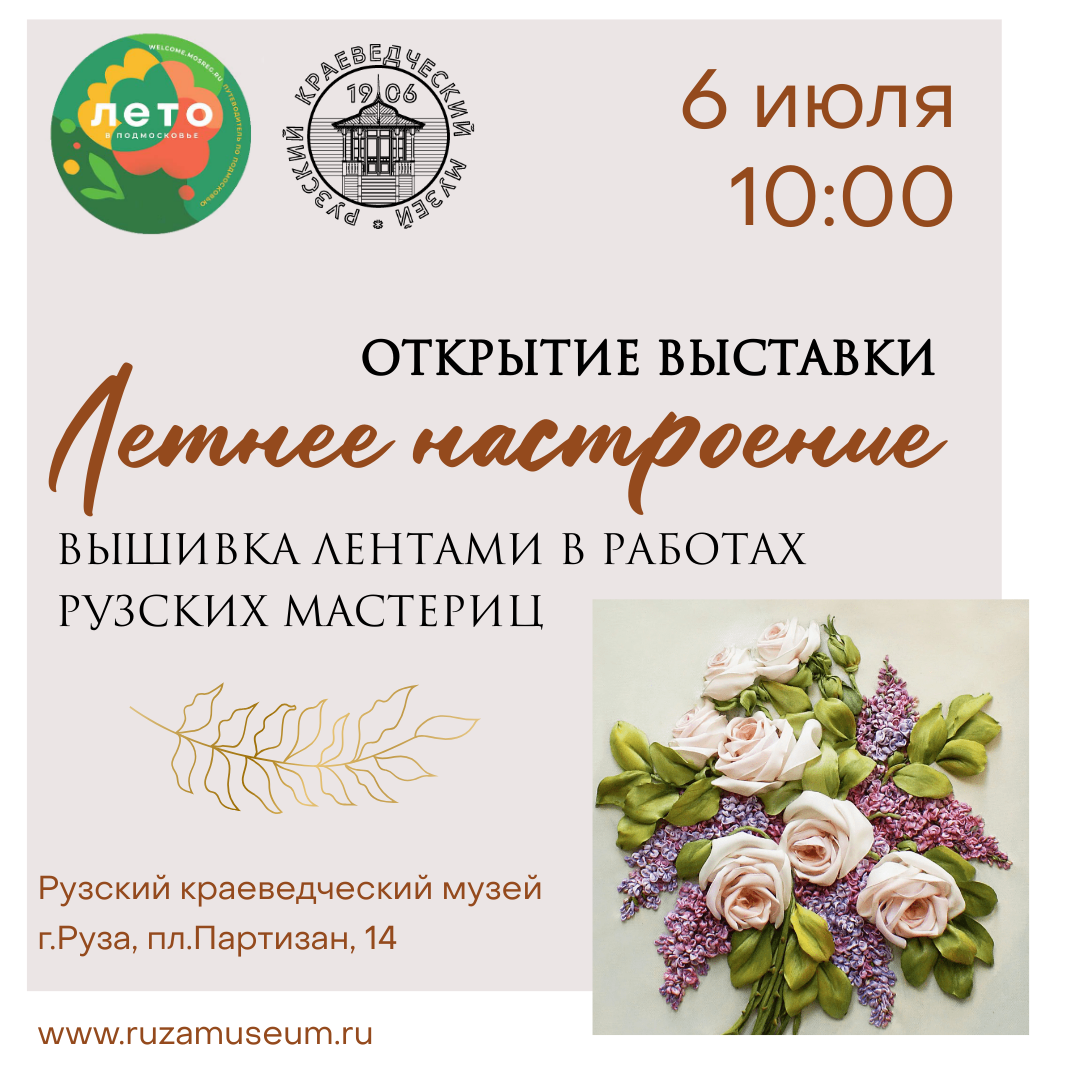 6 июля в 10:00 Рузский краеведческий музей приглашает вас на открытие выставки «Летнее настроение. Вышивка лентами в работах Рузских мастериц».
