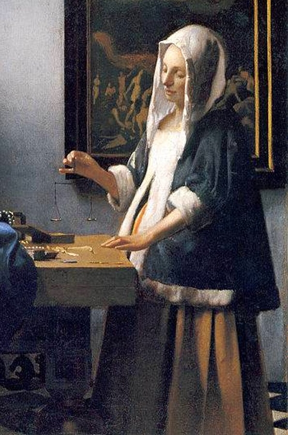Картину также называют «Женщина, испытывающая равновесие». Ранее она была известна как как «Женщина, взвешивающая золото», но при ближайшем рассмотрении выяснилось, что весы в её руке пусты.