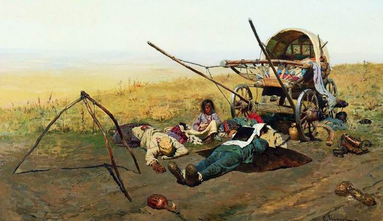 Трагический финал - смерть кормильца, одиночество осиротевшей семьи - подчеркивается пустынным пейзажем выжженной степи. Нелепо торчащие вверх оглобли повозки усиливают впечатление безысходности произошедшего. Павел Михайлович Третьяков, основатель художественной галереи в Москве, приобрел эту картину 25-летнего художника прямо с выставки.