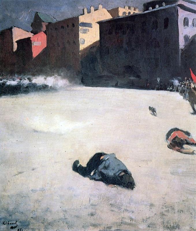 На пустой серой площади остался лежать лицом в землю расстрелянный; вдали высятся мрачные силуэты домов и чуть намечены фигуры уходящих жандармов. Никто из предшественников живописца не достигал такой силы и выразительности в передаче мотива из современной истории. Однозначно художник стремился к искусству остродраматическому, чутко передающему «биение человеческой души», оставаясь художником-реалистом.