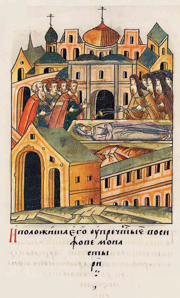 И пришел игумен Иосиф и, видя князя бездыханна, спросил: «Покаялся ли и причастился ли?» И отвечали ему все: «Ни покаялся, ни причастился». И об этом Иосиф весьма огорчился, с сокрушением слезы проливал, ибо князь был ему, как и раньше я сказал, как сын крестный. И выслал всех вон, оставив одного старца Кассиана, прозываемого Босой.