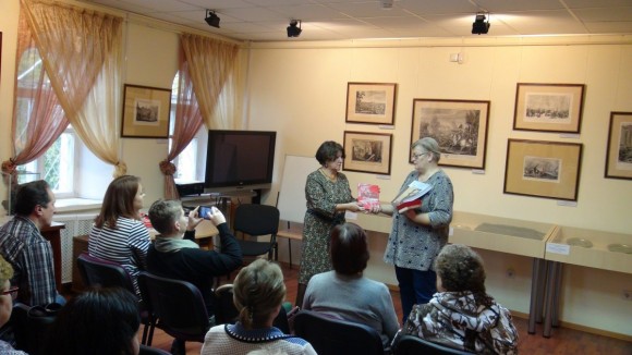 После презентации выставки заведующая научно-экспозиционным и выставочным отделом музея-заповедника «Бородинское поле» Елена Семенищева подарила Рузскому краеведческому музею подарки: открытки и книги.
