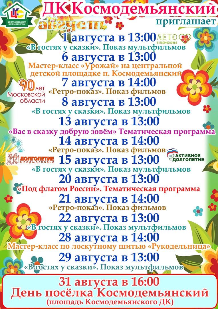 31 августа в 16:00 на площади у Космодемьянского Дома культуры состоится праздничная программа, посвященная Дню поселка Космодемьянский.