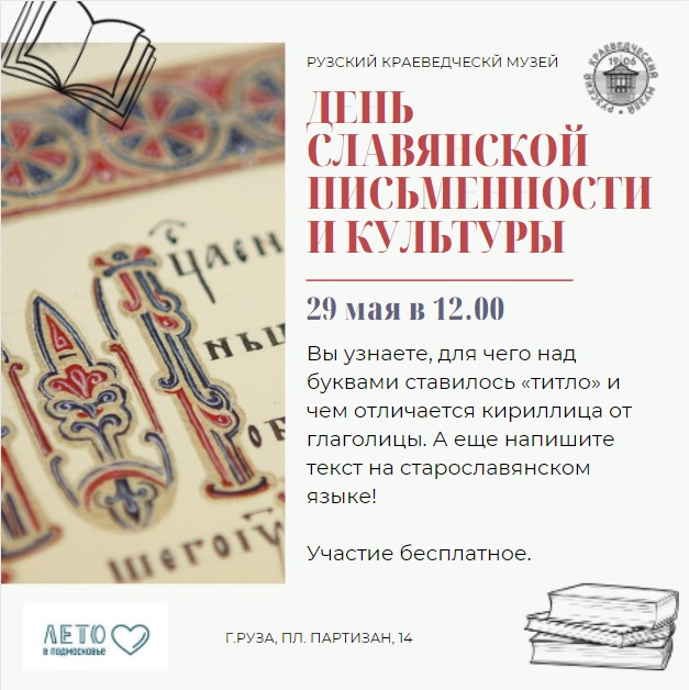 29 мая в 12.00 в Рузском краеведческом музее пройдут лекция и мастер-класс «Русское письмо», приуроченные ко Дню славянской письменности и культуры.