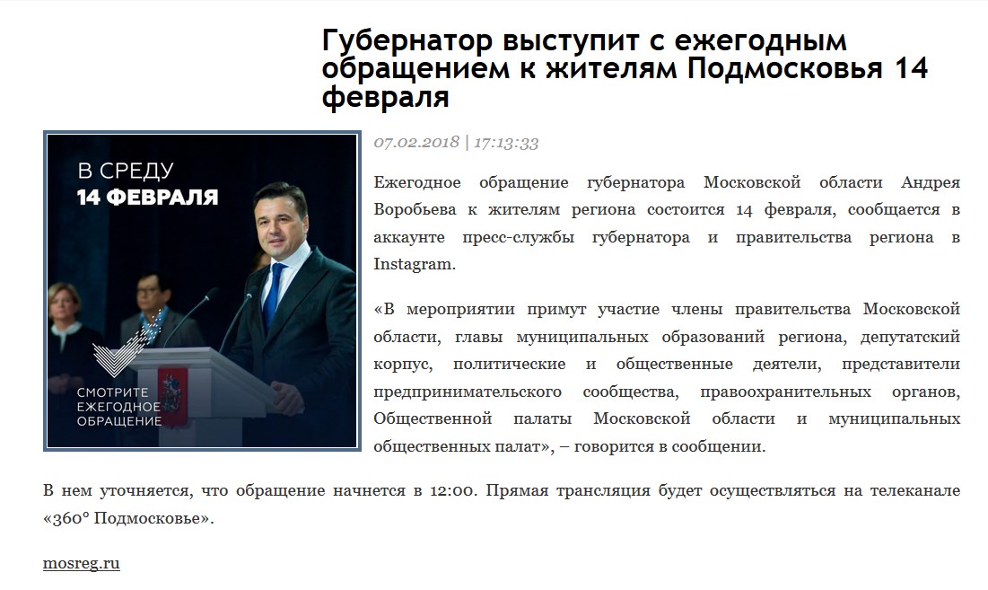 Ежегодное обращение губернатора Московской области Андрея Воробьева к жителям региона состоится 14 февраля.