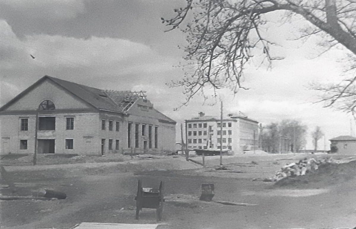 На снимке запечатлено строительство Рузского дома культуры и четырехэтажного кирпичного здания школы – интерната, ныне Муниципальное бюджетное общеобразовательное учреждение «Средняя общеобразовательная школа №3 г. Рузы». Год основания школы – 1993 (реорганизована школа-интернат). Можем увидеть, что достроены этажи главного корпуса, ведутся работы по завершению кровли. Вокруг зданий груды строительного мусора.