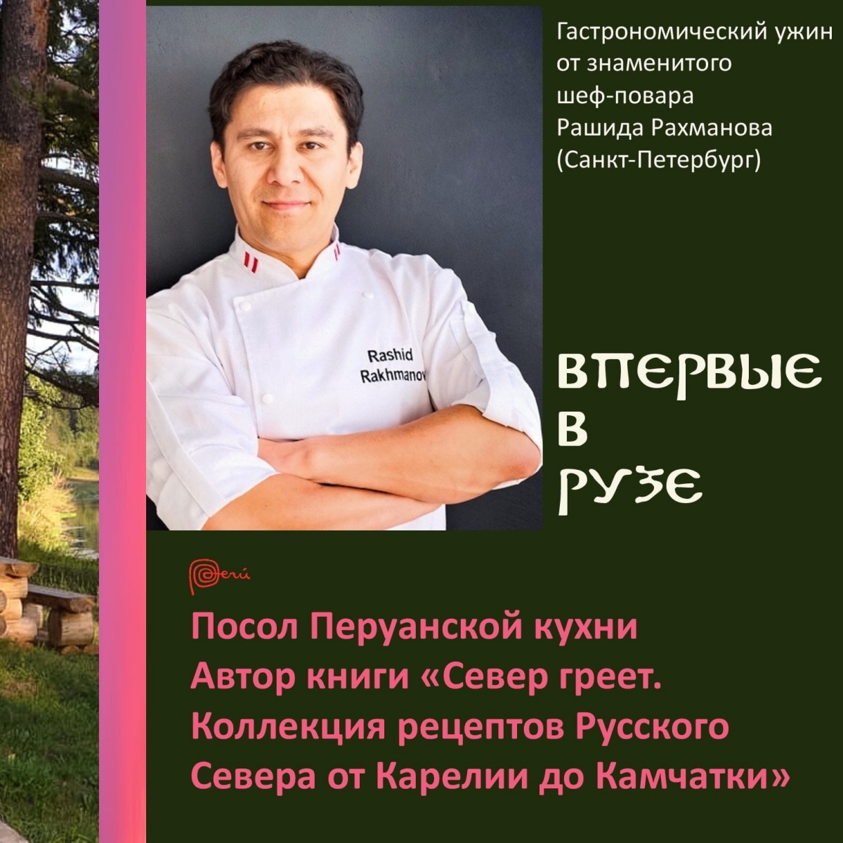 Рашид Рахманов, автор книги «Север греет. Рецепты от Карелии до Камчатки» и амбасадор перуанской кухни в России составил для гостей авторское меню из блюд французской, мексиканской и перуанской кухонь. Бриошь, севиче, запечённый сом и другие деликатесы были приготовлены из продуктов рузских фермерских хозяйств.