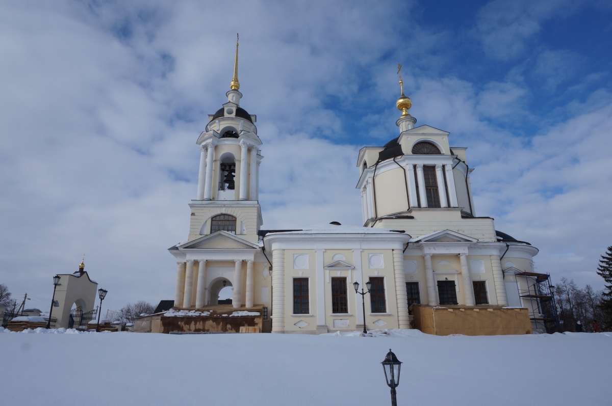 Трехпрестольная церковь Знамения построена в стиле зрелого классицизма. Кирпичное оштукатуренное здание стоит на белокаменном цоколе. В основании храма – бесстолпный четверик, несущий массивную ротонду. К нему примыкает трапезная с двумя теплыми приделами, освященными в 1802 году, и четырехъярусная колокольня.