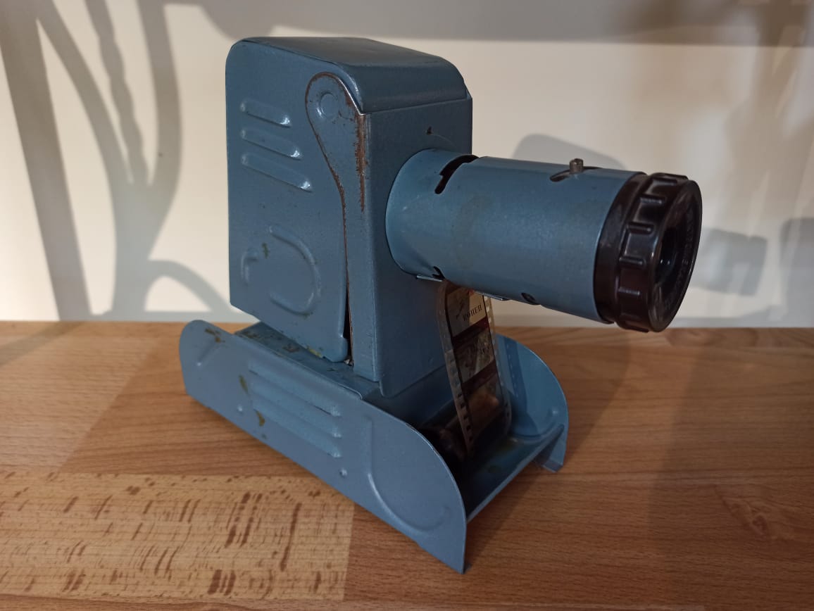 В нашем музее хранится фильмоскоп, сделанный в СССР. Такие устройства предназначены для просмотра диафильмов: они автоматически прокручивают рулонную плёнку. Диафильм — это диапозитивная 35-мм киноплёнка из 30–50 кадров размером 18х24 мм. В отличие от мультфильмов, в диафильмах показываются статичные изображения, больше похожие на книжные иллюстрации. Более современные конструкции диапроекторов позволяют смотреть одиночные слайды.