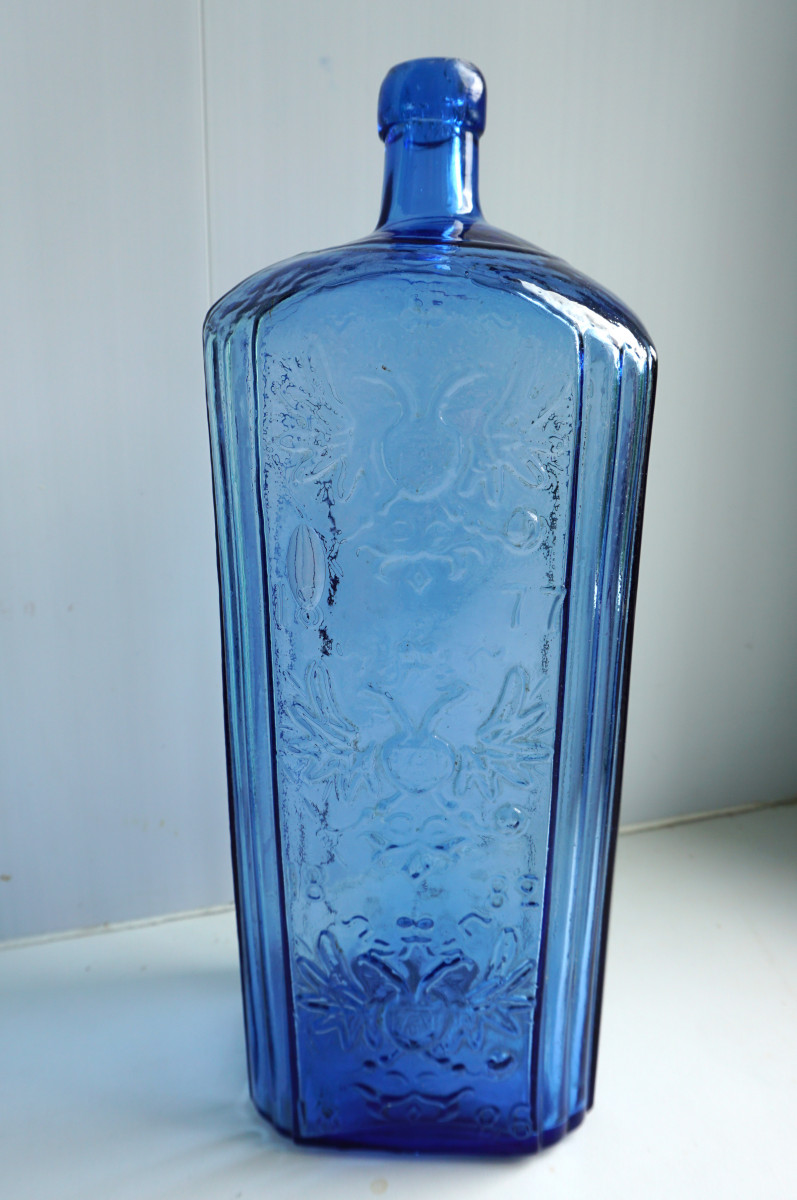 На тулове нашего штофа нанесена выпуклая надпись: «ПОСТАВЩИКЪ ВЫСОЧАЙШАГО ДВОРА ПЕТРЪ АРСЕНТЬЕВИЧЪ СМИРНОВЪ У ЧУГУННАГО МОСТА ВЪ МОСКВЪ». На противоположной стороне – три выпуклых герба царской России, медали за выставки, как на царских самоварах, с датами «1877»; «1882»; «1886».