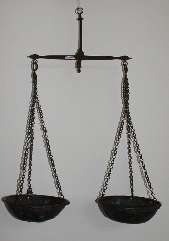 В дворянско-купеческом зале нашего музея представлена коллекция весов и гирь. Есть в коллекции веса «солёные» и «сладкие», на которых соответственно взвешивались соль и песок. Есть весы коромысло, датируемые концом XIX - началом XX века. Они состоят из горизонтально расположенной пластины (полотна), к закругленным концам которого подвижно, на валиках присоединены крючки для подвески чашек. В центре находится неподвижная фигурная стрелка, перпендикулярно расположенная к полотну и подвижной рамки. Рамка вверху заканчивается державкой с круглой шайбой и петлей для подвески, внизу - подвижной конусообразной подвеской.
