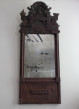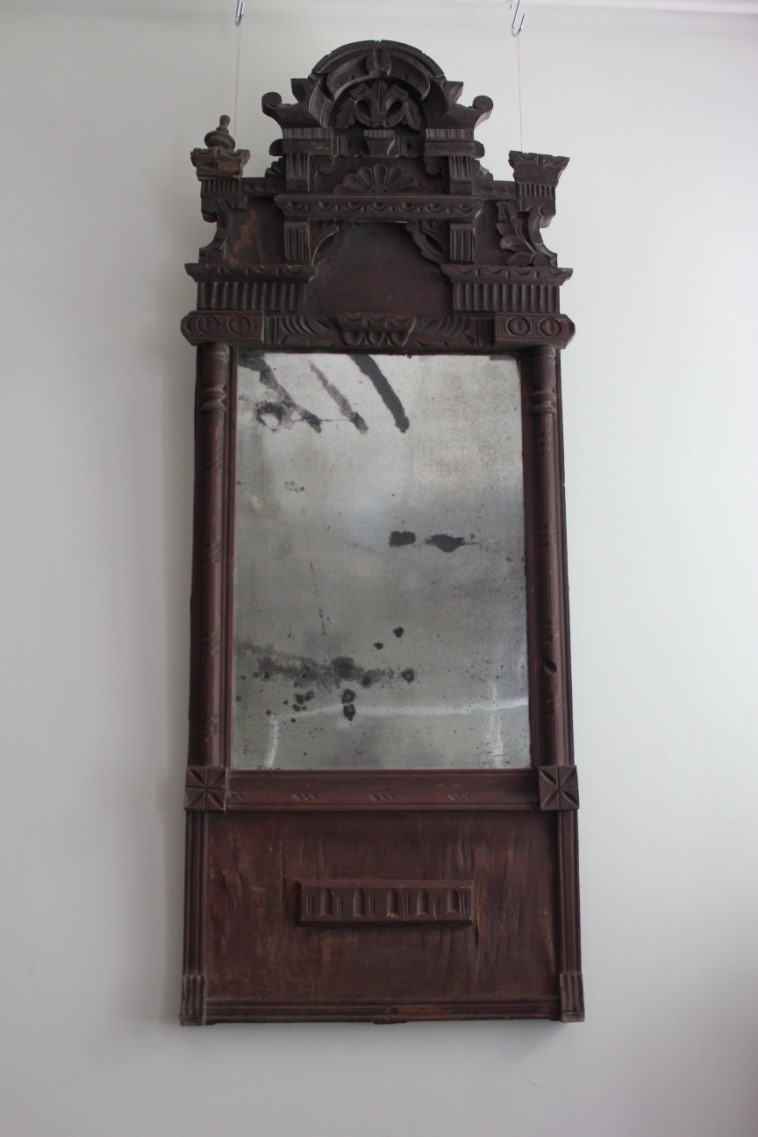В быту начала 20 века не только в богатых домах начали появляться зеркала. Зеркало из нашего фонда мы называем зеркалом «скупого рыцаря». Скорее всего зажиточный крестьянин, пожелавший похвастаться достатком, заказал дорогой оклад из красного дерева, но вот на самом зеркале явно сэкономил.