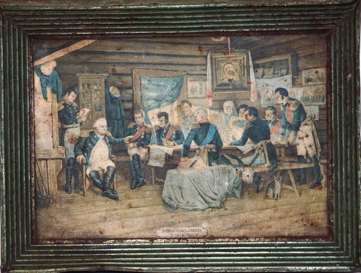 Лицевая сторона крышки оформлена в виде рамки с иллюстрированной картиной «Военный совет в Филях в 1812 г.». Сбоку крышки нанесена надпись: «Карамель высшего качества I∙Л∙Дингъ∙МОСКВА». На внутренней части – «ПАРОВАЯ ШОКОЛАДНАЯ КОНДИТЕРСКАЯ ФАБРИКА ≡I∙ Л∙Дингъ,≡МОСКВА.» «Форма и характеръ жестянки заявлены Департаменту Торговли и Мануфактуръ./ Поддълка будетъ преслъдоваться по закону.»