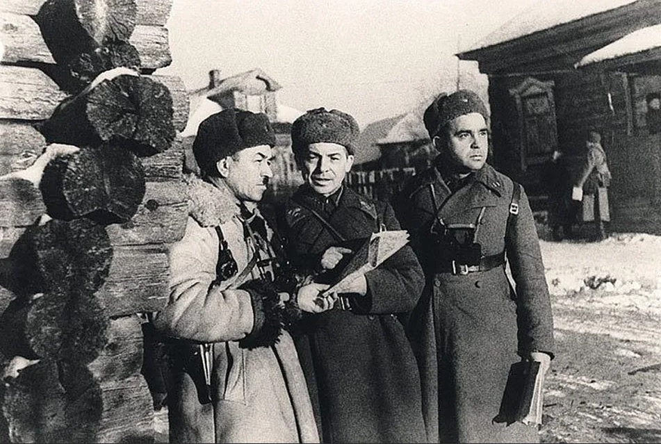 На фото: Комдив И.В. Панфилов с представителями штаба 316-й сд (за несколько часов до гибели). 18 ноября 1941 г., дер. Гусенево, Московская обл.