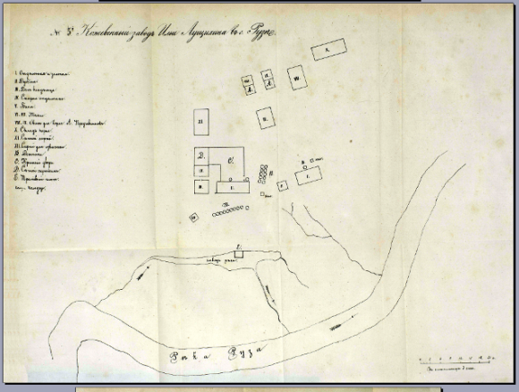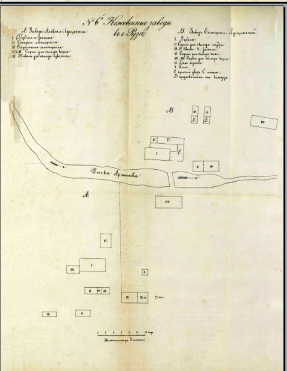 Два других завода находились на правом и левом берегу небольшой речки Артюшки выше города. Завод на правом берегу речки (А) принадлежит купцу 2-й гильдии Алексею Ивановичу Лущихину, а смежный с ними завод (В)- купчихе 2-й гильдии Екатерине Алексеевне Лущихиной.