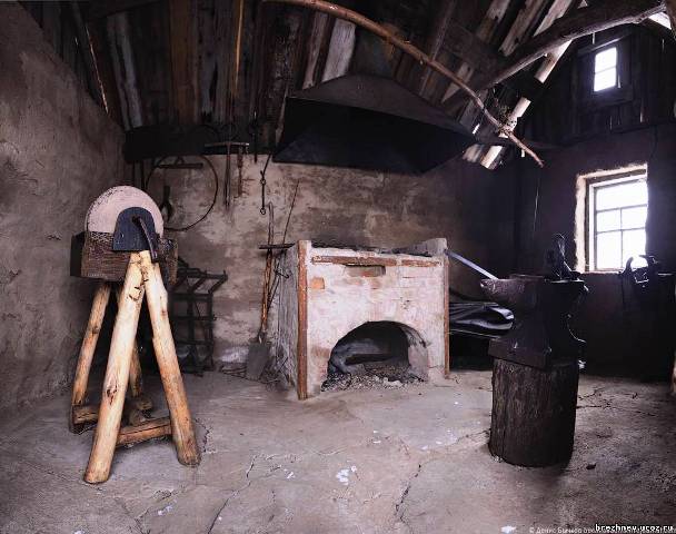 Кузница не имеет пола и потолка. Крыша состоит из драниц, как бы набросанных в беспорядке и несоединяющихся между собой, чтобы в оставляемые отверстия свободно мог проходить дым. Окон в ней нет. В кузнице срединное место занимает горн. Большая часть печей имеет мехи. Некоторые в мехах не нуждаются –тяга идет снизу. Эти печи называются самоплавными.