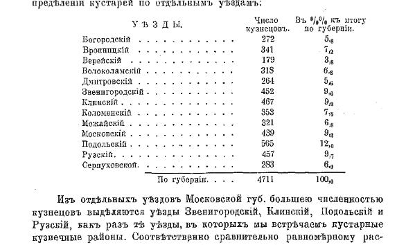 Как видим, большей численностью кузнецов выделяются уезды Звенигородский, Клинский, Подольский и Рузский. Кузнечным районом считалась Орешковская волость, где работали 108 кузнецов. Центром местного кузнечного производства являлось село Волково, в котором работало 15 кузниц из 22 кузниц по всей Орешковской волости.