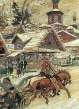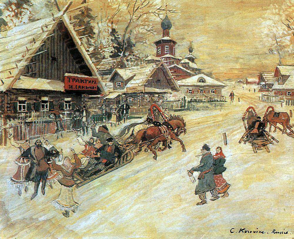На картине «Праздничные гуляния» Константина Коровина мы видим мчащуюся русскую тройку, веселые и шумные компании на оживленной улице – обязательные атрибуты масленичной недели. Свою работу художник написал в 1930-е годы.